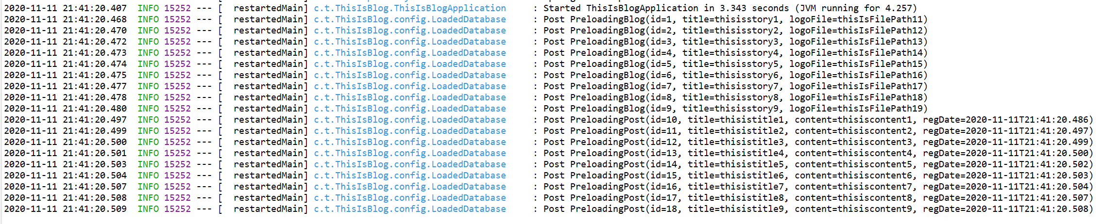 log.info("Post Preloading"+postRepository.save(new Post("thisistitle"+Post_no,"thisiscontent"+Post_no++, LocalDateTime.now())));