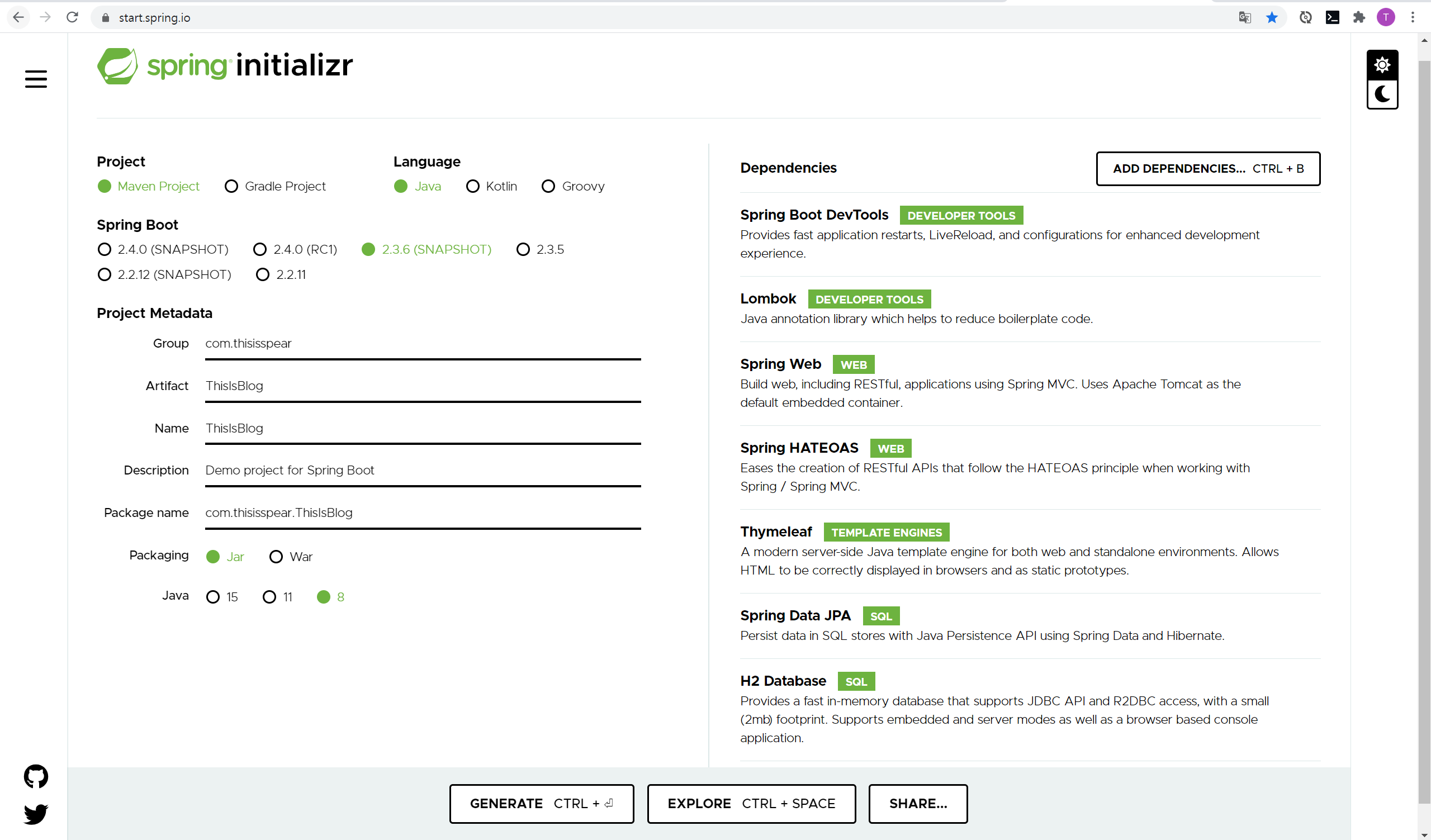 dependency는 devtools, lombok, spring web, hateoas, thymleaf, jpa repository, h2 database을 선택해주면 됩니다. 만약 하나를 빼먹거나 하나를 더 넣었다고 해도 다시 설정할 수 있으니 너무 염려치 않아도 됩니다.