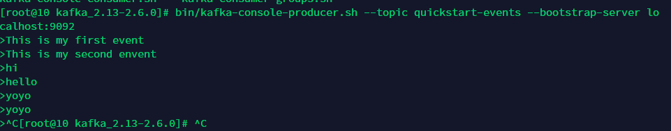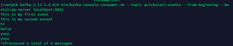 [root@10 kafka_2.13-2.6.0]# bin/kafka-console-consumer.sh --topic quickstart-events --from-beginning --bootstrap-server localhost:9092