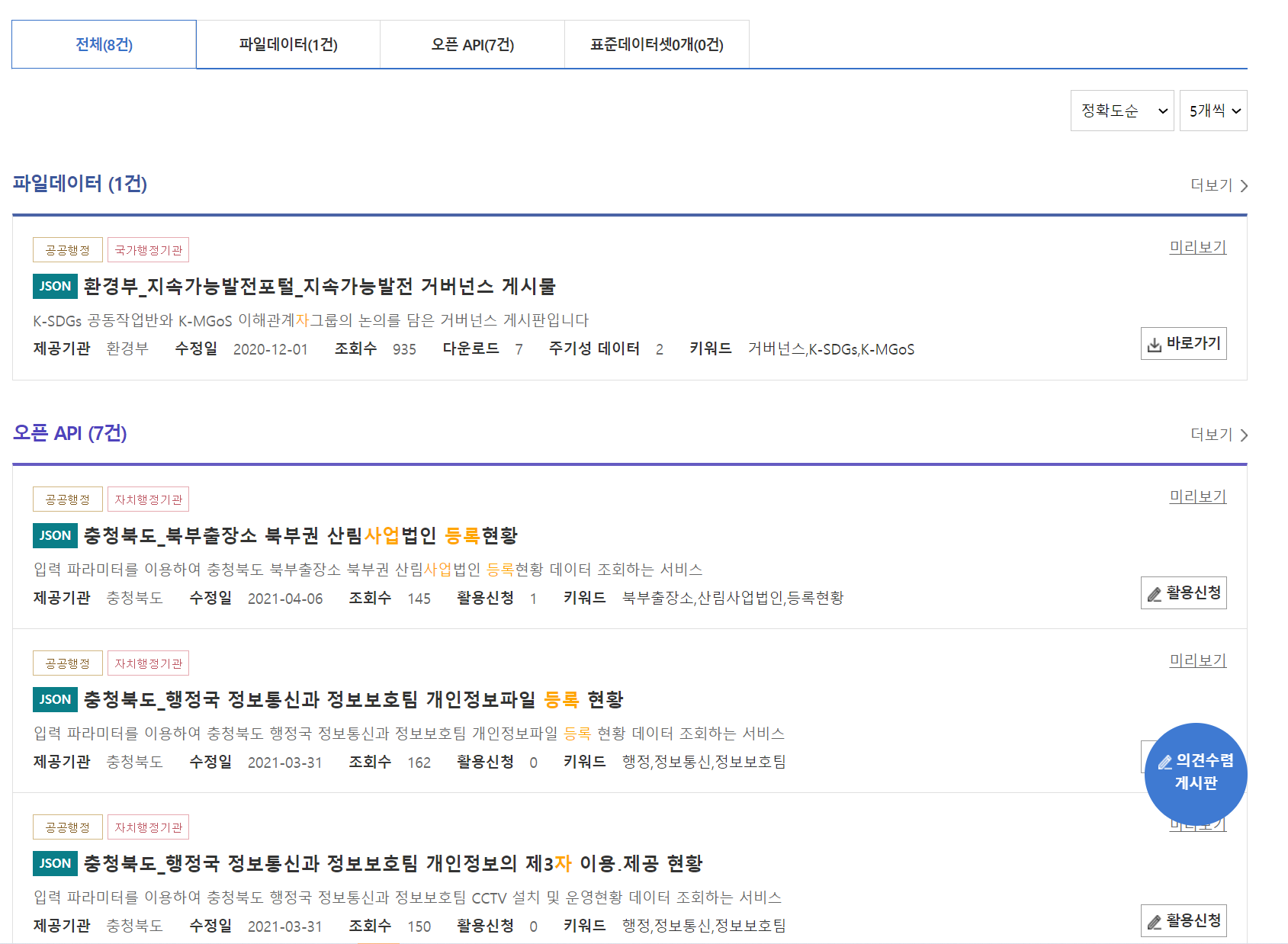 아래와 같이 파일데이터 1건과 오픈 API 7건이 검색된 걸 볼 수 있습니다.