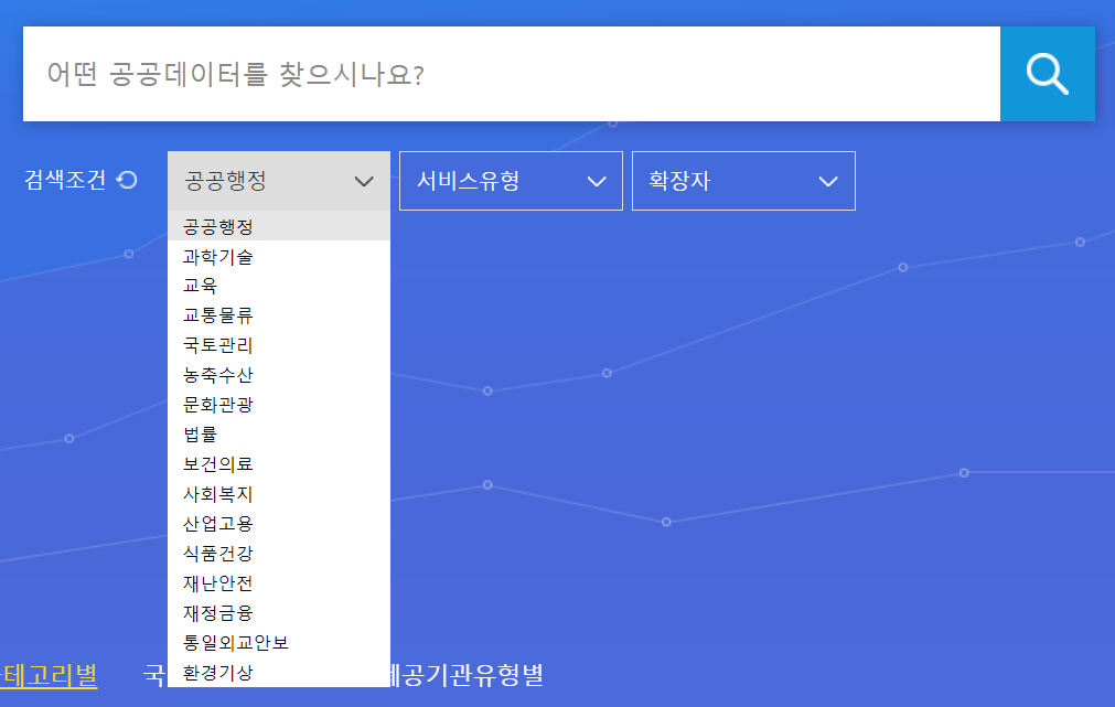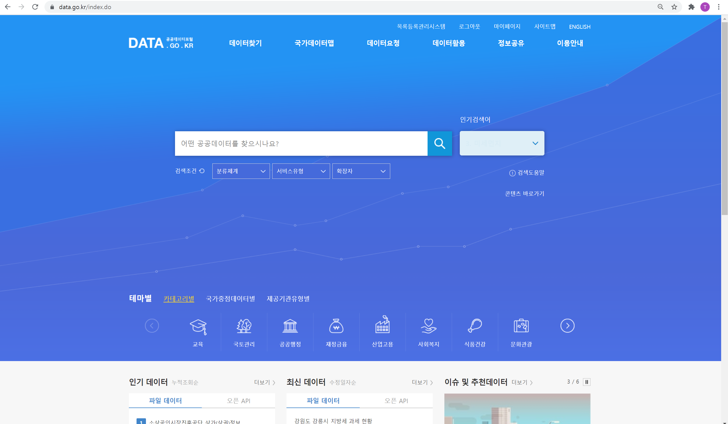 위 사이트를 들어가게 된다면 아래와 같이 데이터를 직접 검색하여 찾을 수도 있고 아래 테마를 선택해 특정한 데이터 리스트를 확인할 수 있습니다.