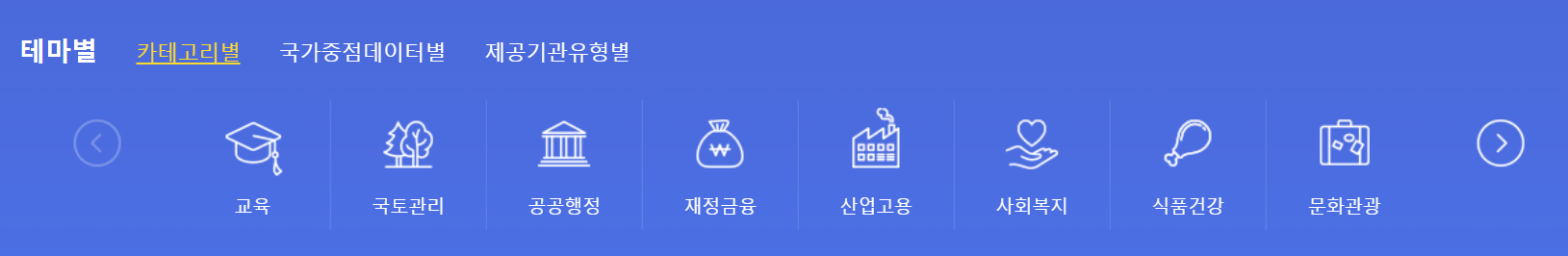 이번에는 테마별 카테고리를 이용해 데이터를 검색해보도록 하겠습니다. 저는 교육 테마에서 데이터를 찾아보도록 하겠습니다.