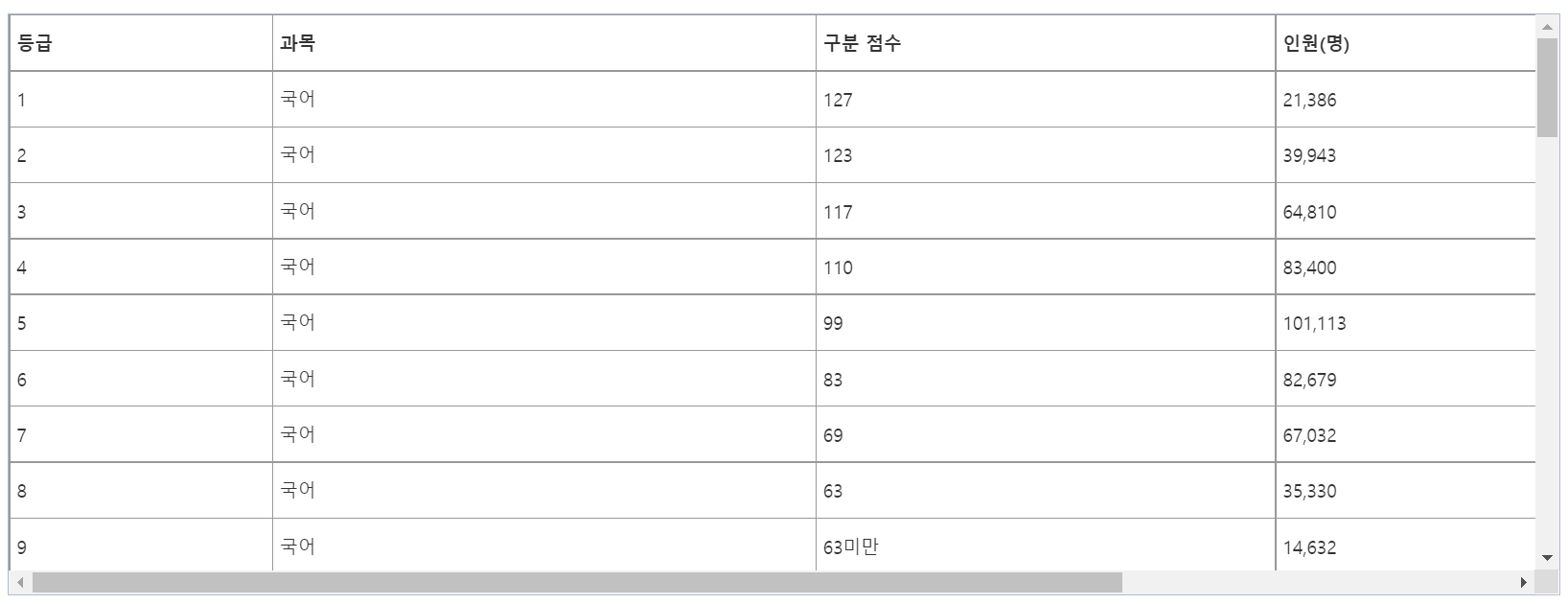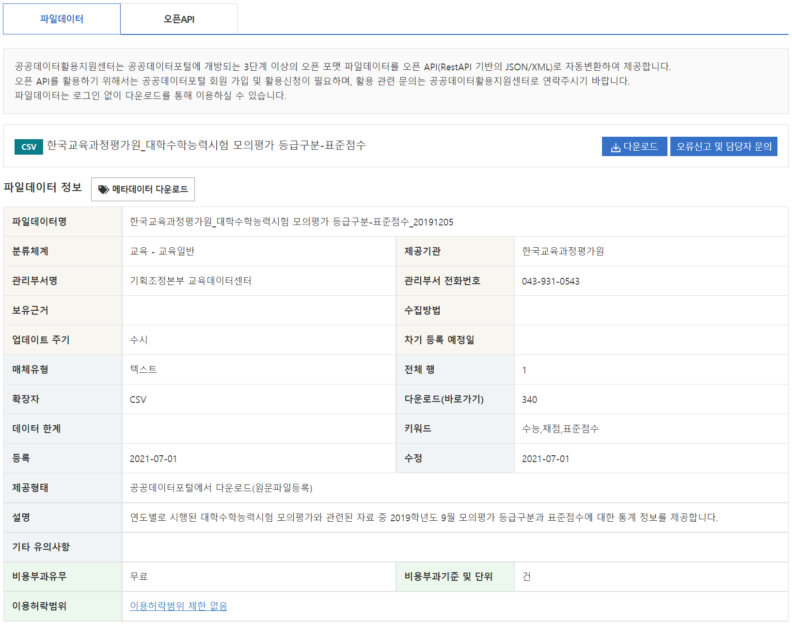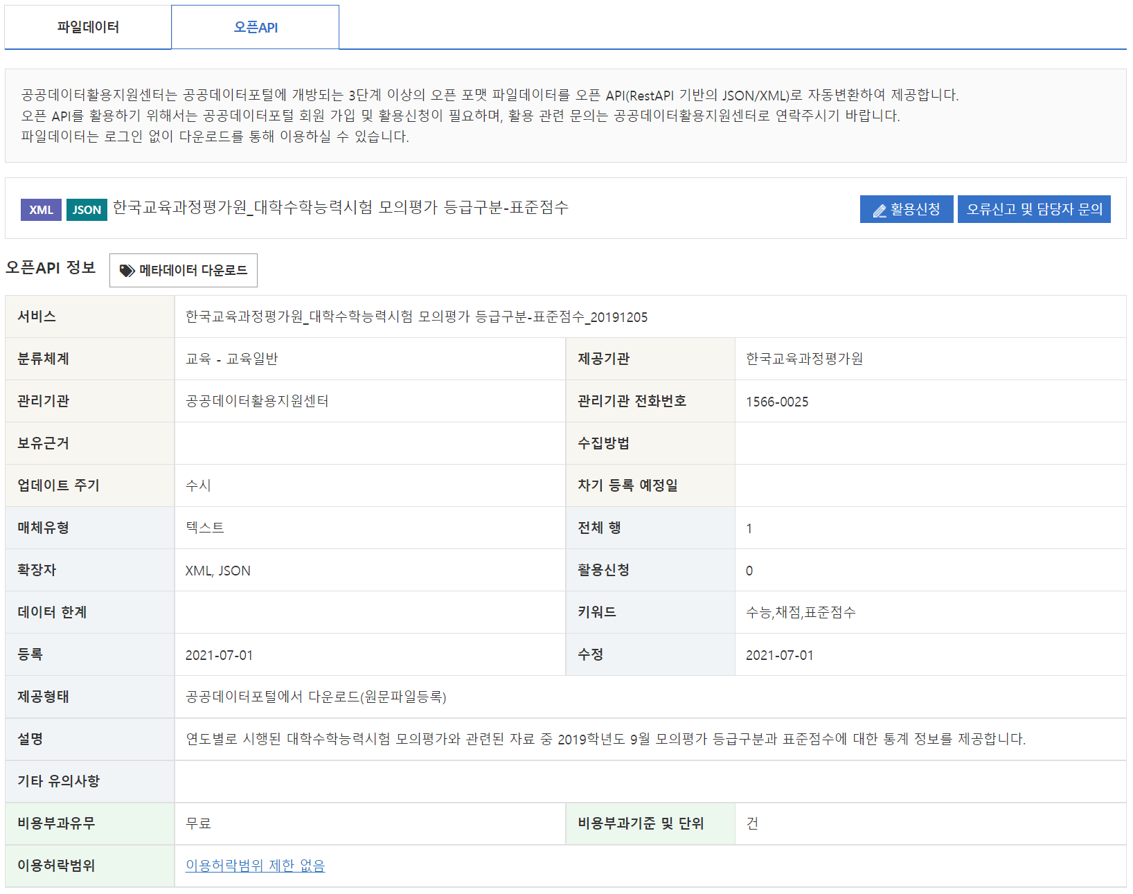 저는 그중에 한국교육과정평과원에서 데이터를 준 대학 수학능력시험 모의평가 등급 구분-표준점수를 사용해보려고 합니다. 이 데이터는 파일 데이터와 함께 오픈 API를 지원했습니다.