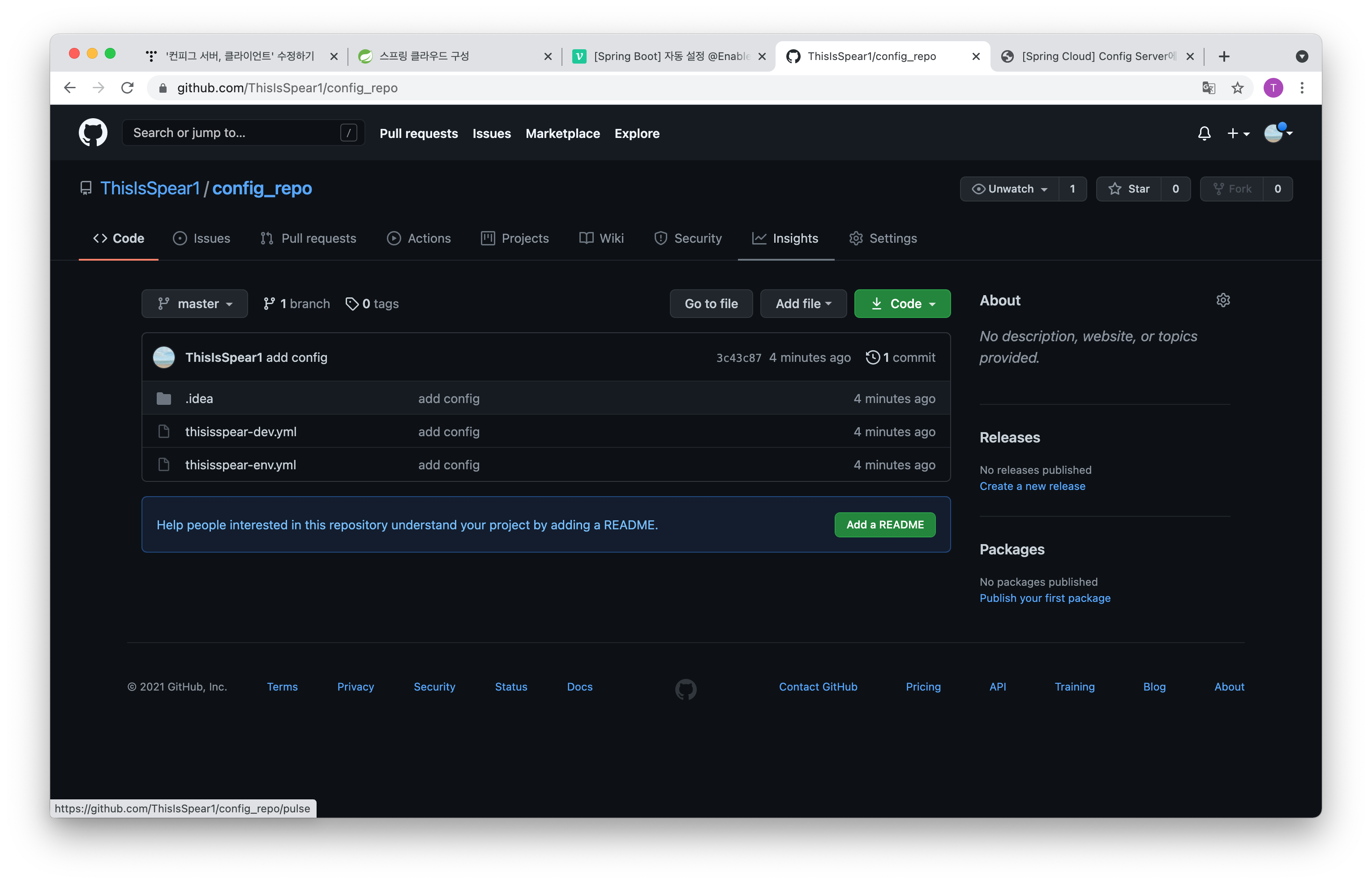 아래는 git 저장소에 config_repo를 clone 한 다음에 각 서버마다의 구성 정보를 저장해주려고 만들어 봤습니다.