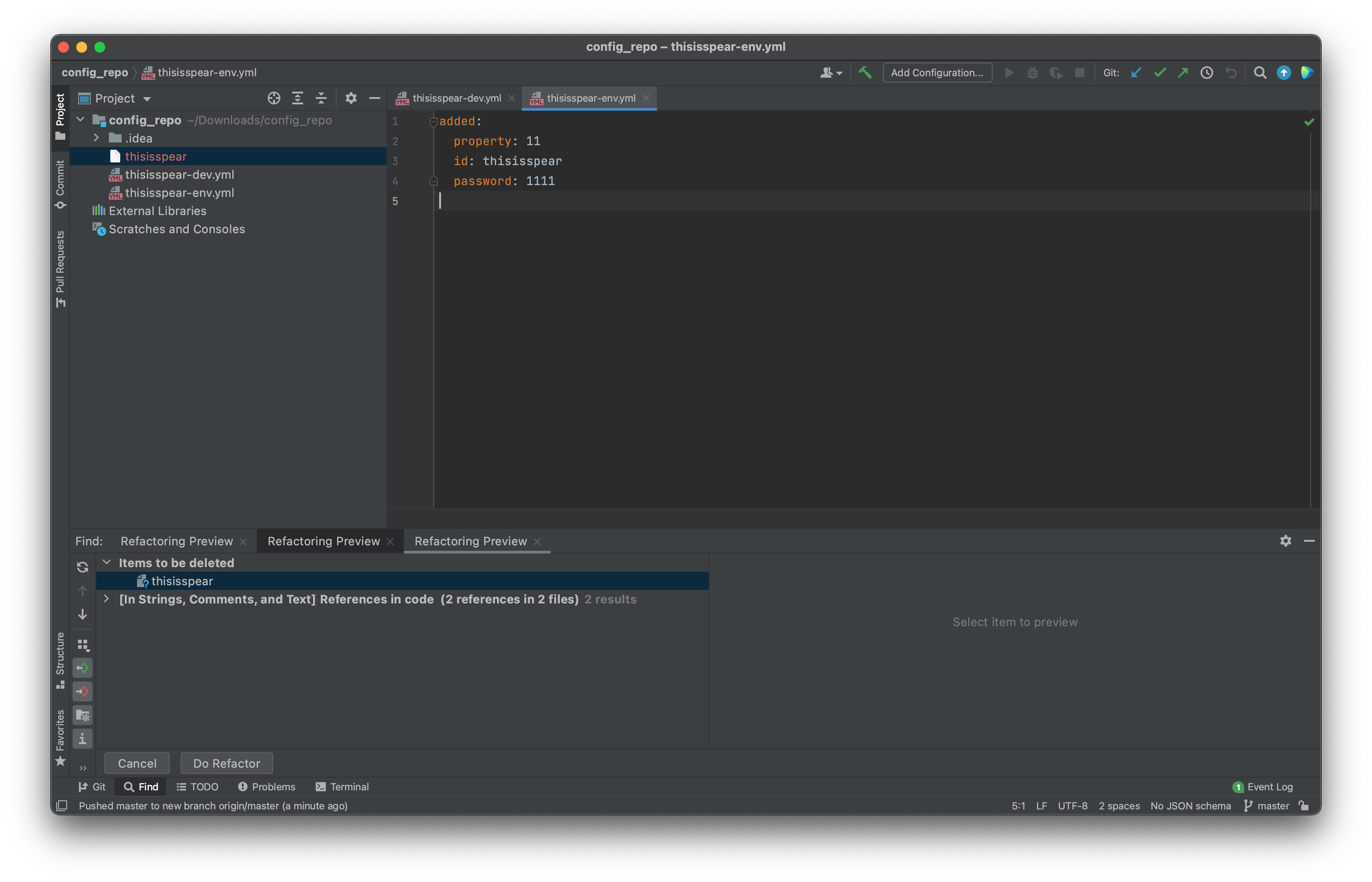 아래와 같이 {프로젝트 이름}-{환경 이름}.yml 순으로 저장해주면 나중에 클라이언트(config-client)에서 이름을 찾은 다음, 환경을 찾아 구성 정보를 읽게 됩니다.