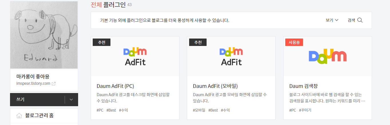 블로그 설정에서 플러그인을 선택해서