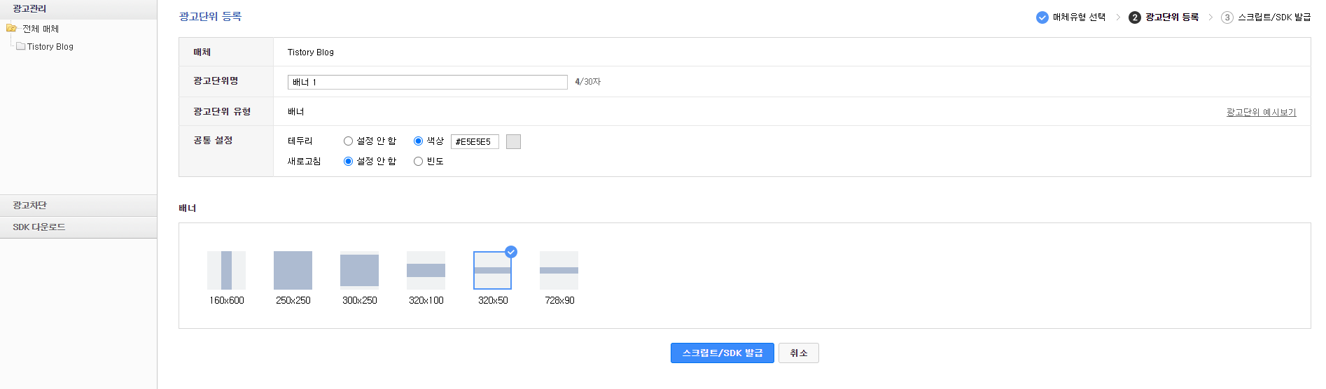 그다음 배너의 크기를 지정하면 되는데요 광고 단위명은 자신이 알아볼 수 있도록만 이름을 저장해주시면 됩니다~