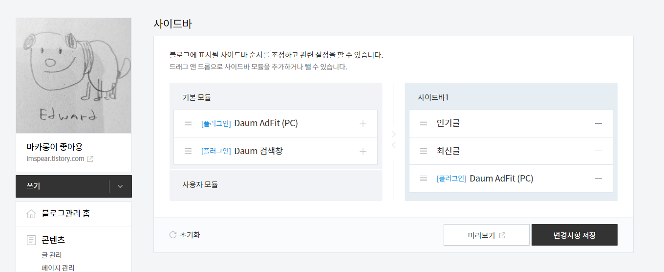 블로그 편집에서 꾸미기 -> 사이드바를 클릭하셔서 Daum AdFit을 클릭해주시면 사이드바에 추가가 됩니다.