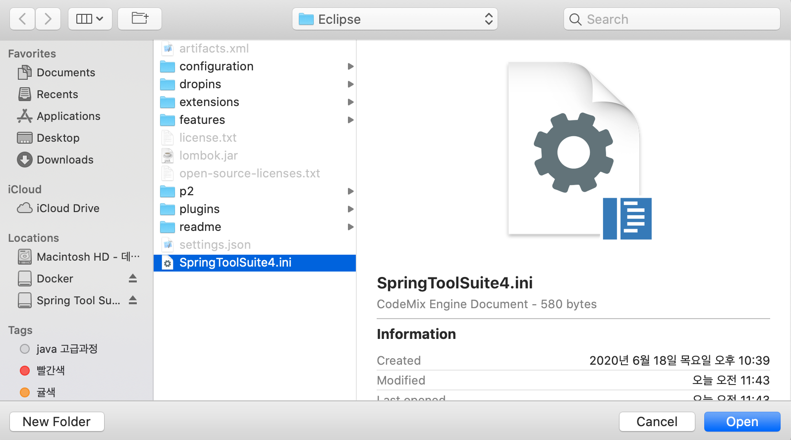 sts4 -> contents -> Eclipse -> SpringToolSuite4.ini 파일 찾아서 open