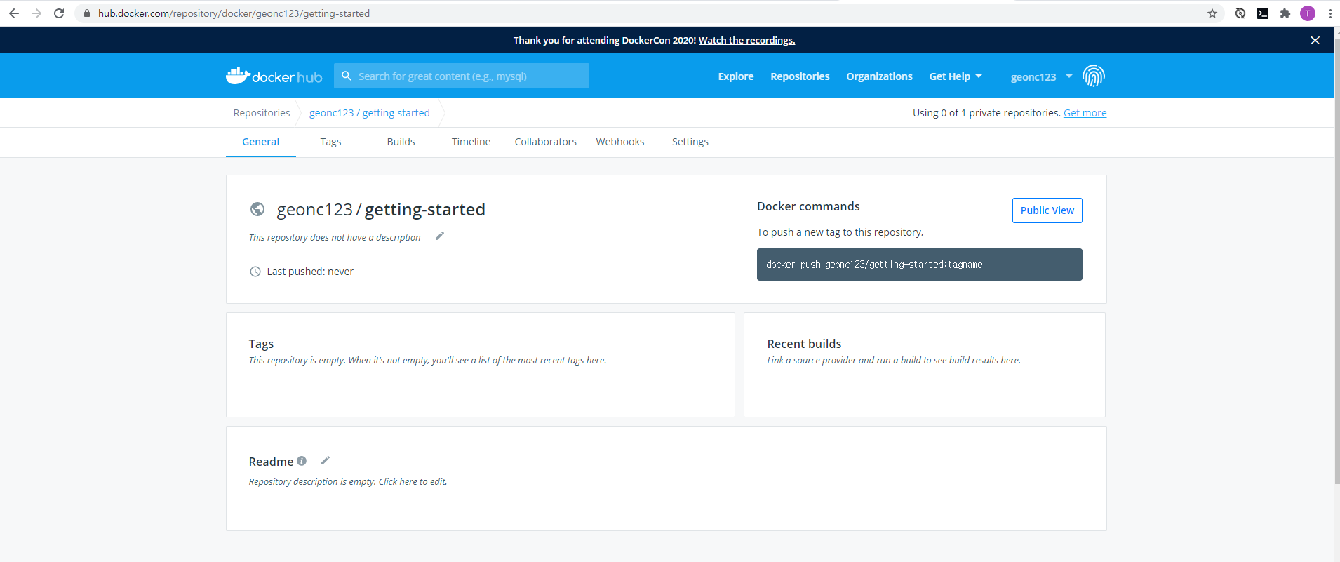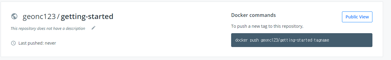 명령 행에서 Docker Hub에 표시되는 push 명령을 실행하십시오. 명령은 "docker"가 아닌 네임 스페이스를 사용합니다.