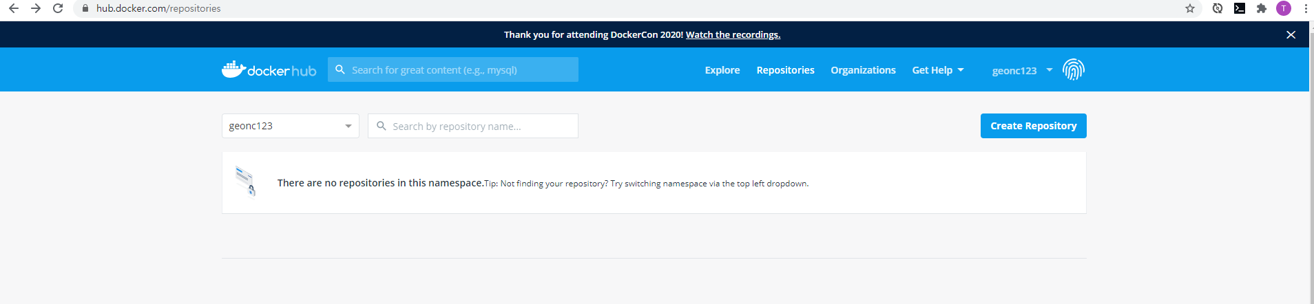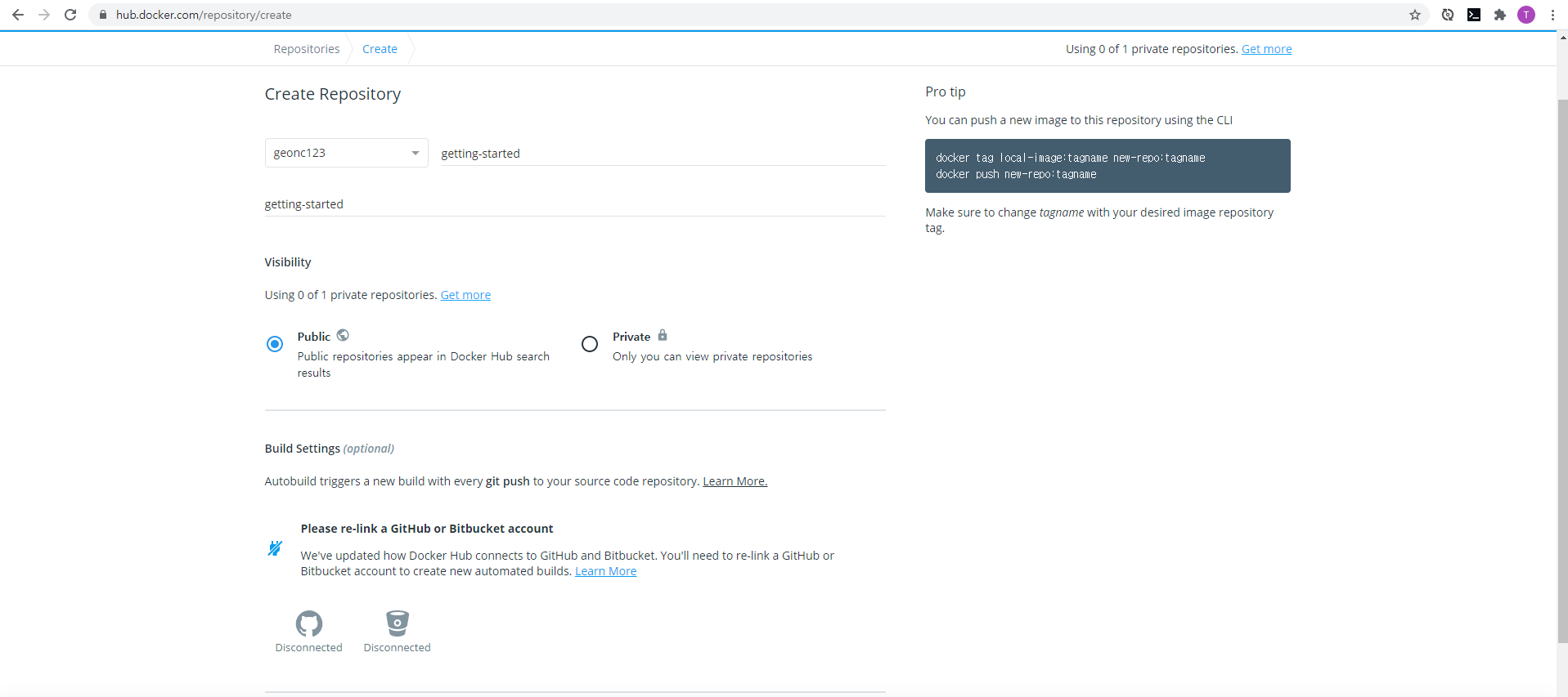 이미지를 푸시하려면 먼저 Docker Hub에서 저장소를 만들어야합니다.