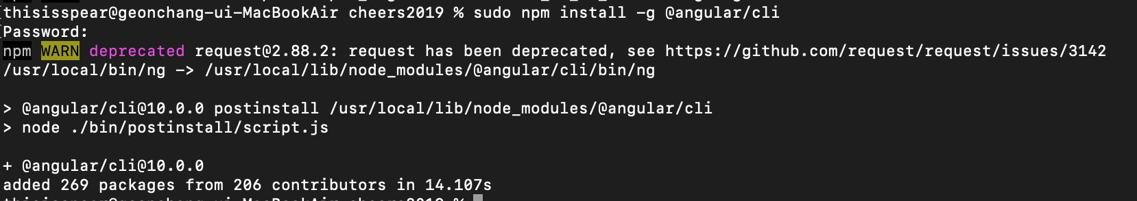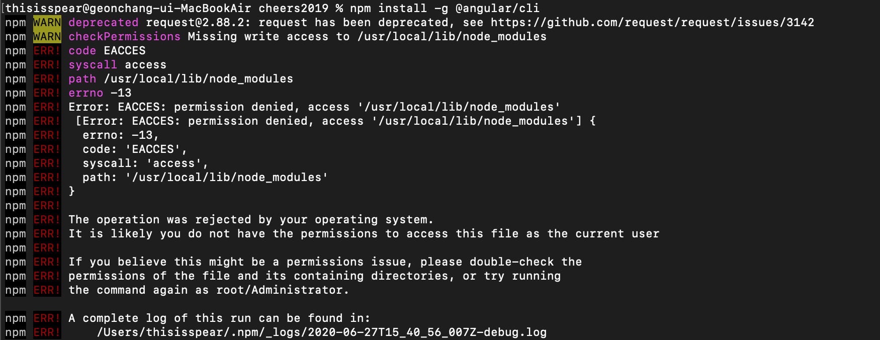 앵귤러를 시작하기 위해서는 앵귤러 CLI를 설치해야 합니다. 하지만 맥북에서는 접근자의 권한이 없으면 이렇게 다운로드가 실패합니다.