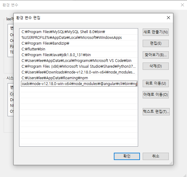 윈도에서는 간단하게 환경변수를 직접 설정하여 ng와 같은 명령어들을 사용해야 합니다. npm, flutter, ng, pip 등 각 오픈 소스에서 제공하는 명령어를 사용하려면 PATH(환경변수)를 직접 설정해야 하는 경우가 많습니다.