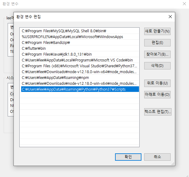 위의 스크린샷에 보이는 경로를 시스템 환경변수에 추가해 주셔야 합니다.